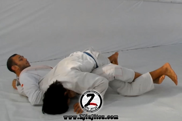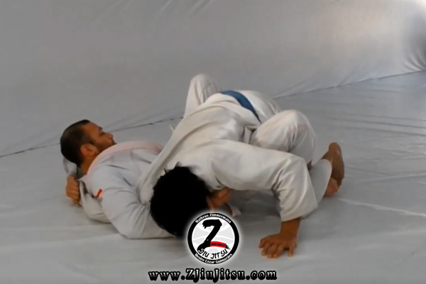 No começo do movimento, faço pegada com minha mão esquerda na manga do adversário trazendo o braço para cima da minha cabeça. Neste momento, utilizo as pernas para puxar o adversário para cima de mim e passar por baixo da sua axila, trancando o braço dele em baixo das minhas costas.